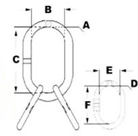 | Master Link A | Master Link B | Master Link C | Sub-elos D | Sub-elos E | Sub-elos F | Carga de Trab. (45° kgf) | Peso unit. (kg) |